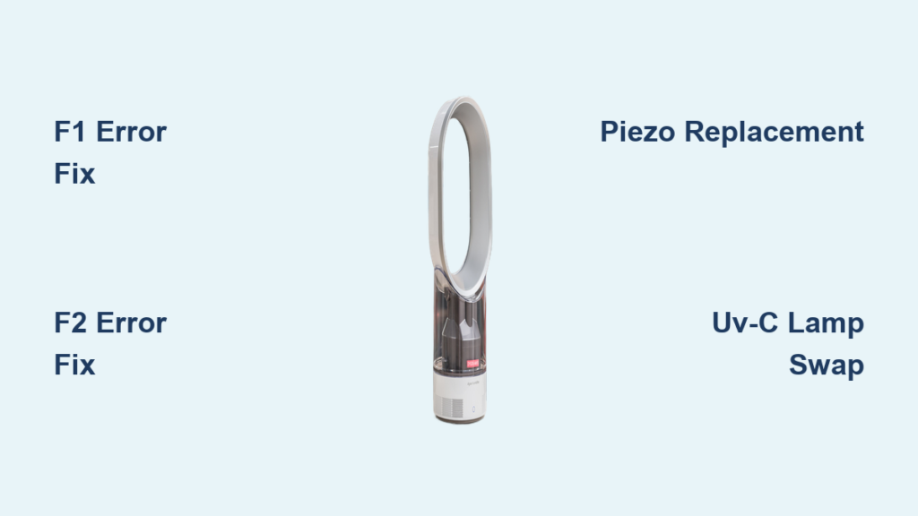 When your Dyson AM10 shows F1, the ultrasonic mist generator has completely failed. You’ll notice the fan runs normally, but zero mist appears—even in cold rooms where vapor should be visible. This isn’t a clog issue; it’s a component failure. The piezo (part #966569-01) is a consumable ceramic disc that vibrates at 1.7 MHz to create mist. Like a lightbulb, it wears out after 12-18 months of regular use. Critical warning: If you hear a loud humming sound without mist, the piezo is actively failing and may overheat nearby components. Don’t keep running it—this risks damaging the main control board.