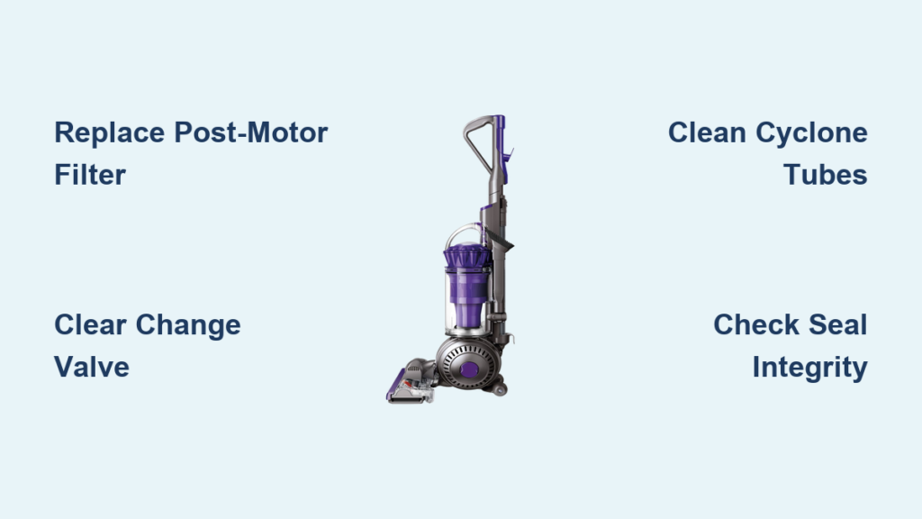 When your Dyson Ball Animal 2 not suctioning at all but the brushroll spins, you’re facing a complete airflow blockage – different from gradual suction decline. This specific failure mode means zero debris enters the bin despite motor operation, often triggering thermal shutdown within 90 seconds. Start diagnosis by eliminating false positives: Confirm the bin is empty (not just below MAX line), the cyclone assembly is fully locked with an audible click, and the soleplate is securely attached to the floorhead. If suction remains dead, focus exclusively on these critical pathways. Never assume “no visible clog” means clear airflow – compacted dust deep in cyclones or a collapsed post-motor filter creates invisible barriers. Skip this targeted diagnosis and you’ll waste hours checking irrelevant components while the thermal cutoff repeatedly shuts down your vacuum.