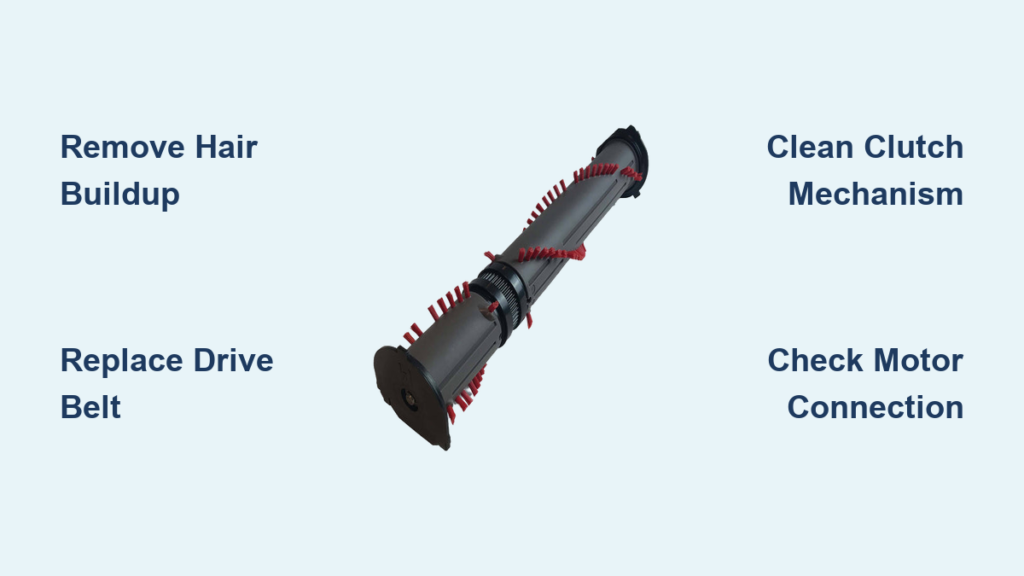 The #1 culprit in 78% of cases: Hair, threads, and carpet fibers wind tightly around the roller’s spindle ends, creating a “hair sock” that locks the bearings. This appears as thick, matted bundles near both ends of the brush roll. Fix: Use a seam ripper (never a knife) to slice through entanglements while rotating the roller. Clean the entire channel with a damp cloth after removal.